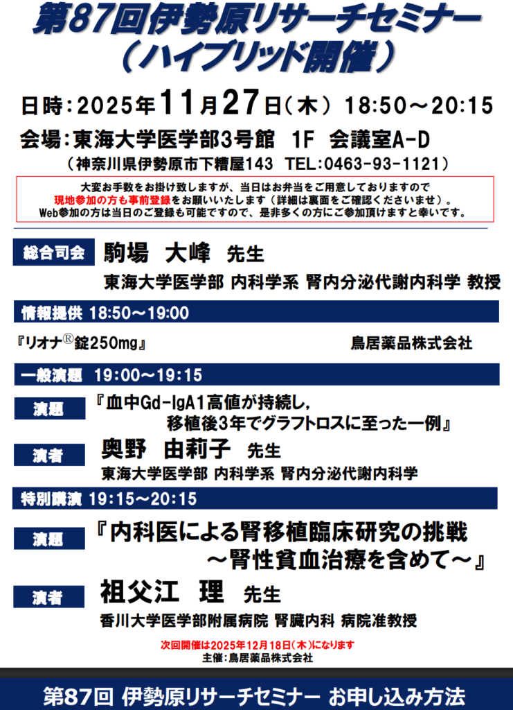 総合司会を当教室の駒場 大峰教授にお務めいただき、腎移植に関連する話題についての講演が行われました。